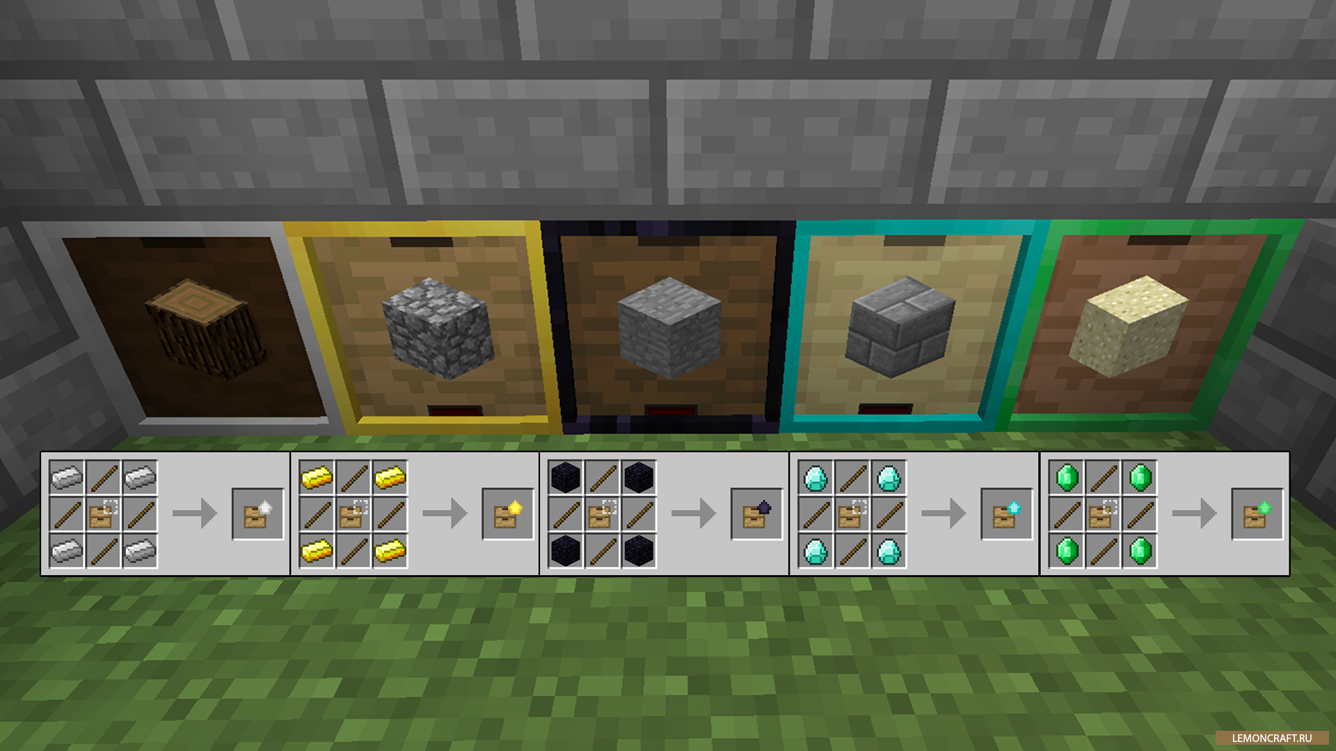 Мод Storage Drawers добавит в игру новые ящики в которых можно хранить различные предметы. Ящики будут 5 видов и отличатюся по вместимости. Для того, что бы положить предмет в ящик, нужно нажать ПКМ, что бы взять из ящика ЛКМ, что бы узнать что лежит в ящиках нажмите Shift + ПКМ. Как видите управление очень простое.